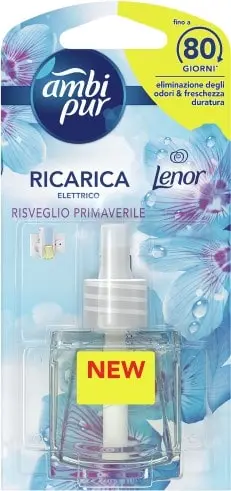 Ricarica liquida al Risveglio di Primavera per diffusore elettrico Ambi-pur. Elimina gli odori sgradevoli e diffonde una duratura e fresca profumazione. Il piacere di rientrare a casa ed essere accolti da una preziosa sensazione di pulito e benessere. Dura fino ad 80 giorni.