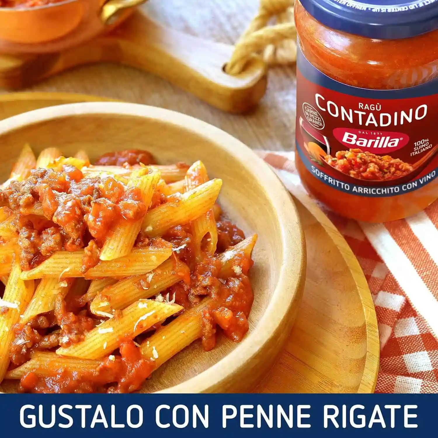 Ideale con le Mezze Maniche, il Ragù Contadino con Vino Rosso Barilla è pronto da versare direttamente sulla pasta appena scolata. Per esaltare profumo e sapore degli ingredienti si consiglia di scaldarlo a fuoco lento o nel microonde, dopo aver aperto il vasetto.