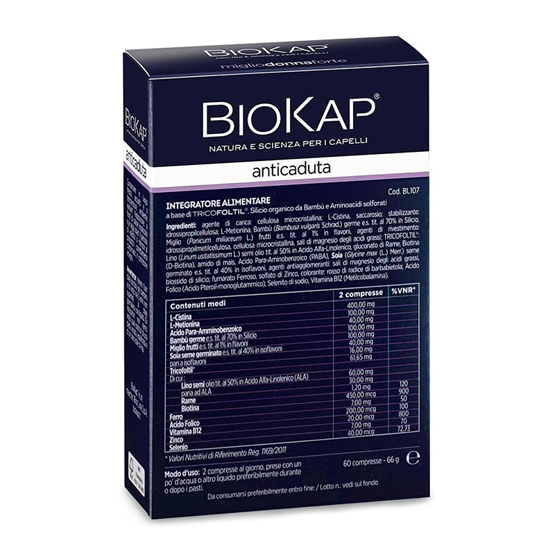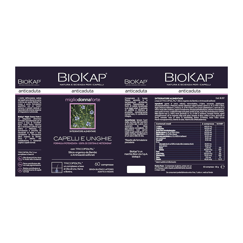 BioKap Anticaduta Miglio Donna Forte, dunque, è un integratore alimentare formulato appositamente per la donna con il complesso Tricofoltil, a base di Olio di Lino ricco in Acido Alfa-Linolenico, Rame che contribuisce alla normale pigmentazione dei capelli e Biotina che contribuisce al mantenimento di capelli normali. BioKap Anticaduta Miglio Donna Forte contiene Ferro, Acido Folico, vitamina B12, Amminoacidi solforati, quali Cistina e Metionina, e Fitoestratti di Miglio e Soia. Completano la formulazione Silicio organico da Bambù, Zinco e Selenio, che contribuiscono a mantenere unghie e capelli normali.