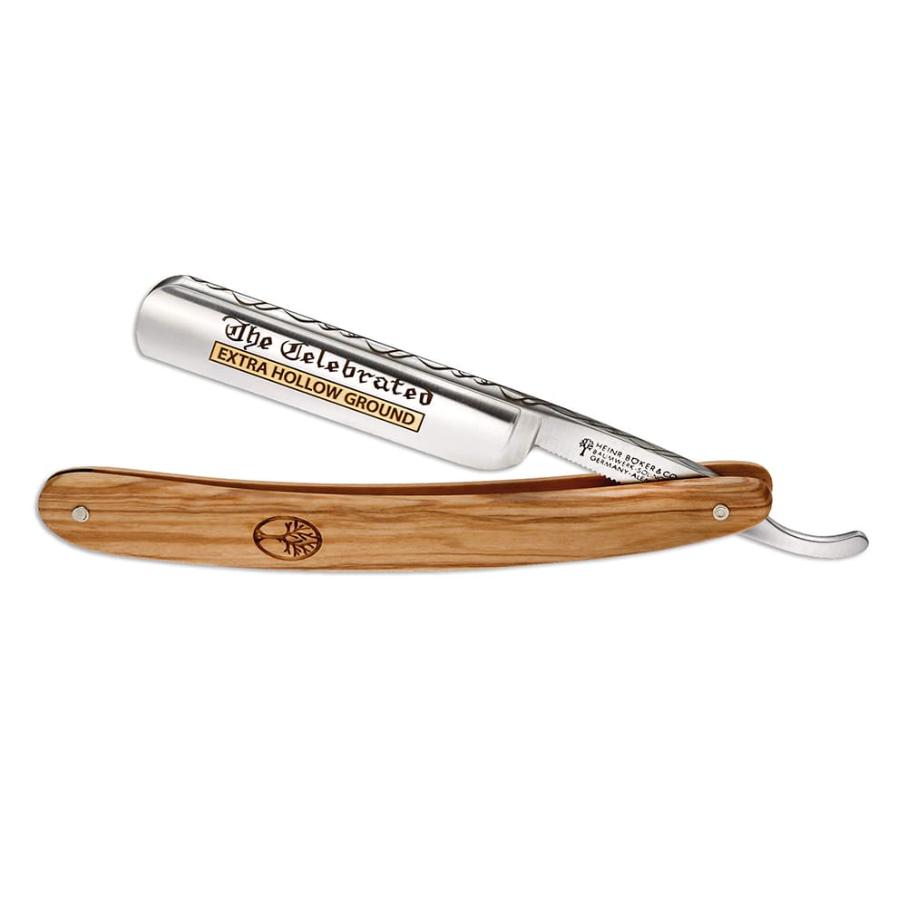 Il legno d’ulivo scelto per il manico è selezionato a mano e conferisce al rasoio a mano libera The Celebrated Olive un accento particolare e una venatura vivace. Questo modello è impreziosito dal classico simbolo dell’albero Boker, delicatamente inserito nel manico. Il dorso della lama presenta un’ulteriore decorazione artistica sotto forma di raffinati ornamenti.