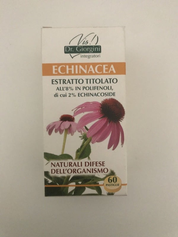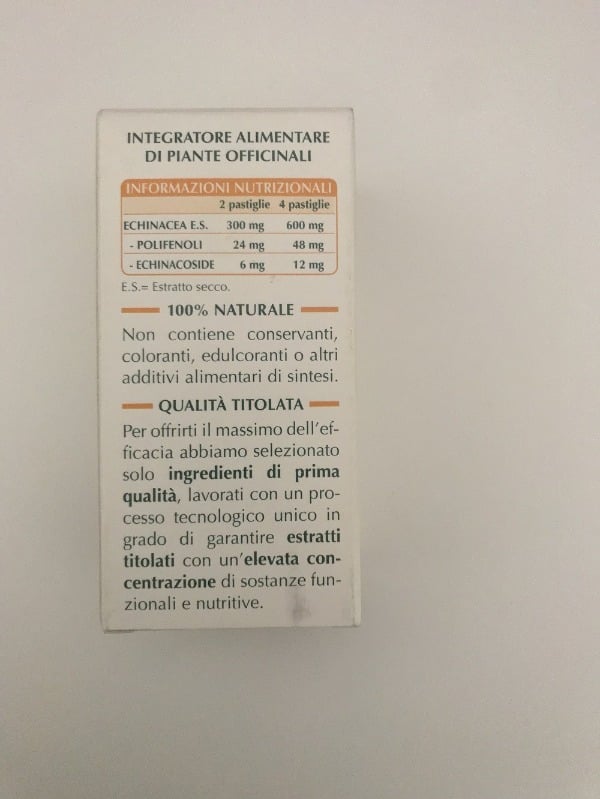 Echinacea Echinacea angustifolia e purpurea radici E.S. titolato al 8% in polifenoli di cui 2% echinacoside maltodestrine da mais o riso cellulosa microcristallina° gomma arabica° silicio biossido°° magnesio stearato di origine vegetale°°.