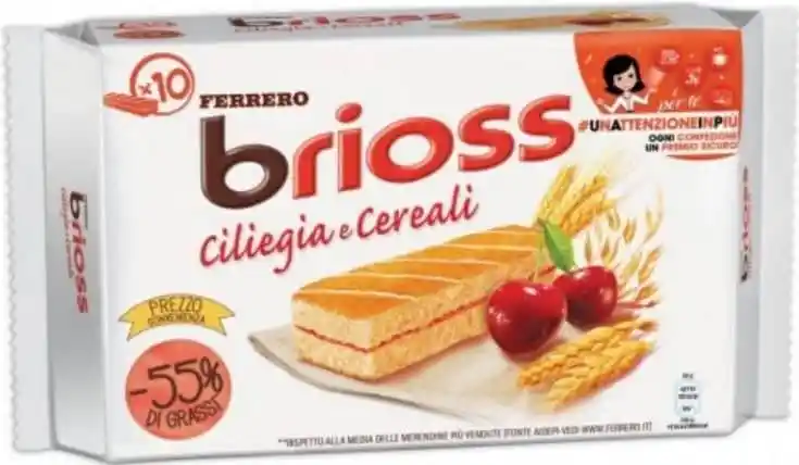 Amido di frumento, Sciroppo di glucosio-fruttosio, Emulsionanti (mono e digliceridi degli acidi grassi), Purea di carota, Albume d’uovo in polvere, Farina di frumento (28%), Sale, Latte scremato in polvere, Zucchero, Agenti lievitanti (carbonato d’ammonio, difosfato disodico, carbonato acido di sodio), Uova (12,5%), Fiocchi macinati (2,5%) di: orzo e avena, Aromi, Olio di palma non idrogenato, Correttore di acidità (acido citrico), Confettura di ciliegia 22% (zucchero, purea di ciliegia 41%, sciroppo di glucosio-fruttosio, gelificante: pectine; correttore di acidità: acido citrico).