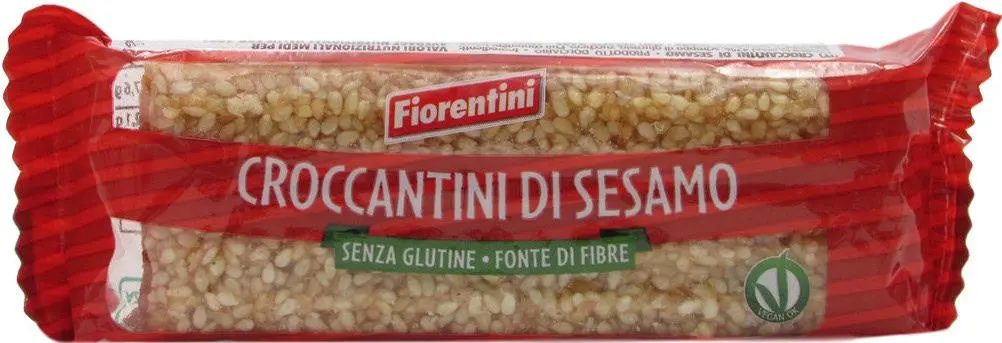 sesamo in grani 47%, sciroppo di glucosio, zucchero. Può contenere tracce di arachidi, e frutta a guscio. Prodotto vegan free, senza glutine, senza soia né uova né latte, senza olio di palma, senza solfiti.