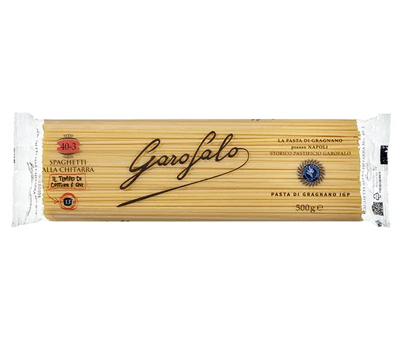 Provengono dalla tradizione abruzzese e sono simili a spaghetti ma con una sezione quadrata, gli Spaghetti alla chitarra Garofalo sprigionano in bocca il sapore genuino della Pasta di Gragnano IGP, trafilata al bronzo e lavorata con passione.