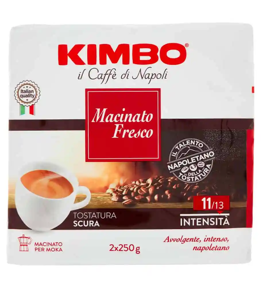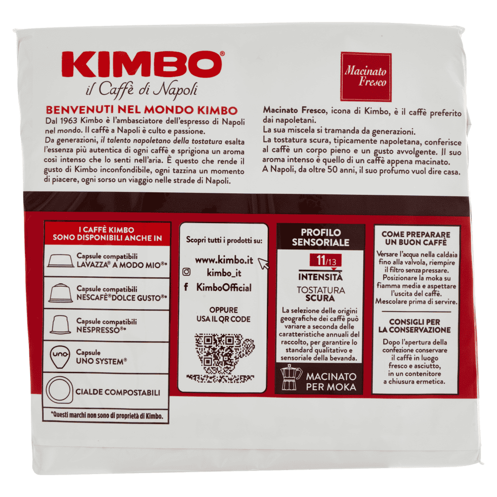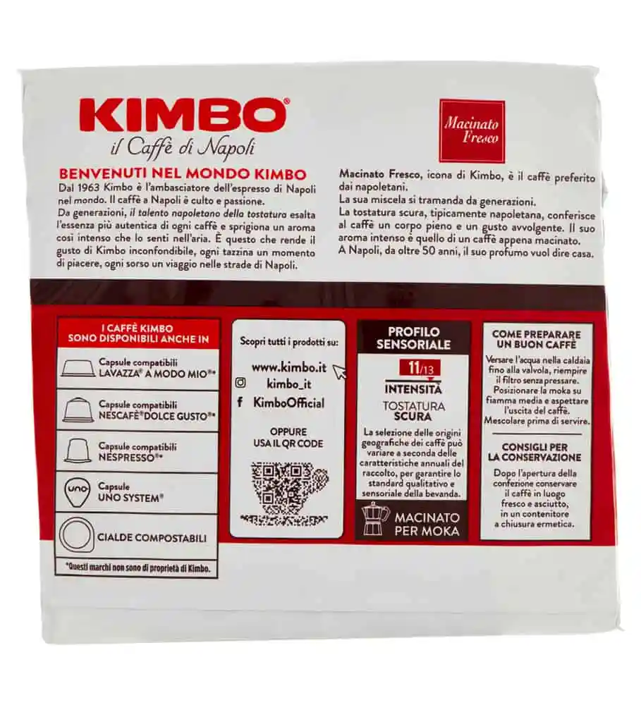 Il caffè torrefatto e macinato KIMBO Macinato Fresco è un connubio irripetibile tra fragranze che rimandano a paesi lontani e un gusto forte e deciso, tipico della tradizione napoletana. Proveniente dal Brasile e dal Centro America, una volta giunto a Napoli i suoi chicchi vengono miscelati con sapienza e tostati dai mastri torrefattori KIMBO. La tipica tostatura scura napoletana conferisce al caffè un corpo pieno, un gusto avvolgente e un aroma intenso, per un piacere irripetibile da gustare al bar, in ufficio e anche a casa.