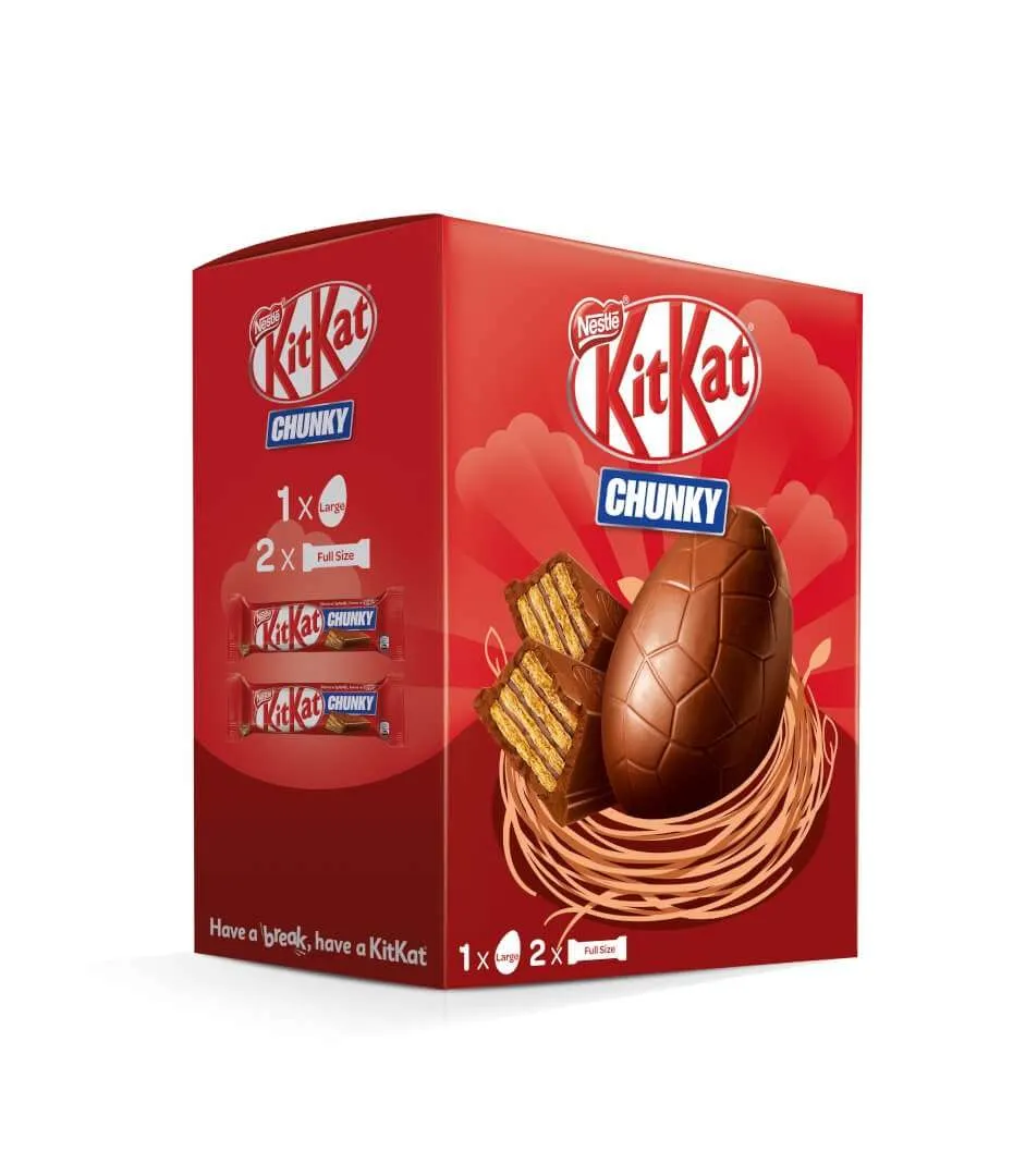 Prova anche tu il golosissimo Kit Kat Chunky 230g GRANDE + 2 barrette kit kat, l’unico uovo di Pasqua con il cioccolato ancora più denso e croccante. In più troverai 2 barrette kit kat.