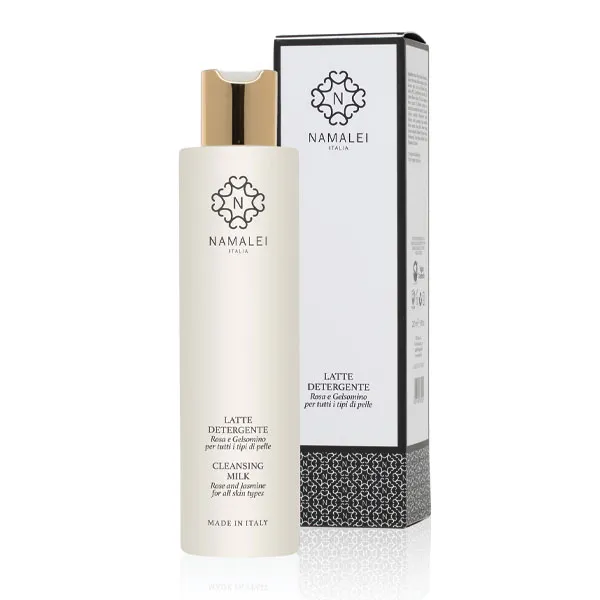 Namalei – Latte Detergente Rosa e Gelsomino 200 ml è costituito da una formula ricca di oli vegetali di Riso ed Albicocca per una detersione delicata ma profonda, di viso, occhi e labbra.
