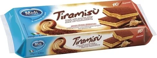 Il soffice pan di spagna Midì, preparato con cura e ingredienti selezionati, si riempie di una gustosa farcitura al Tiramisù: niente è più buono della semplicità.