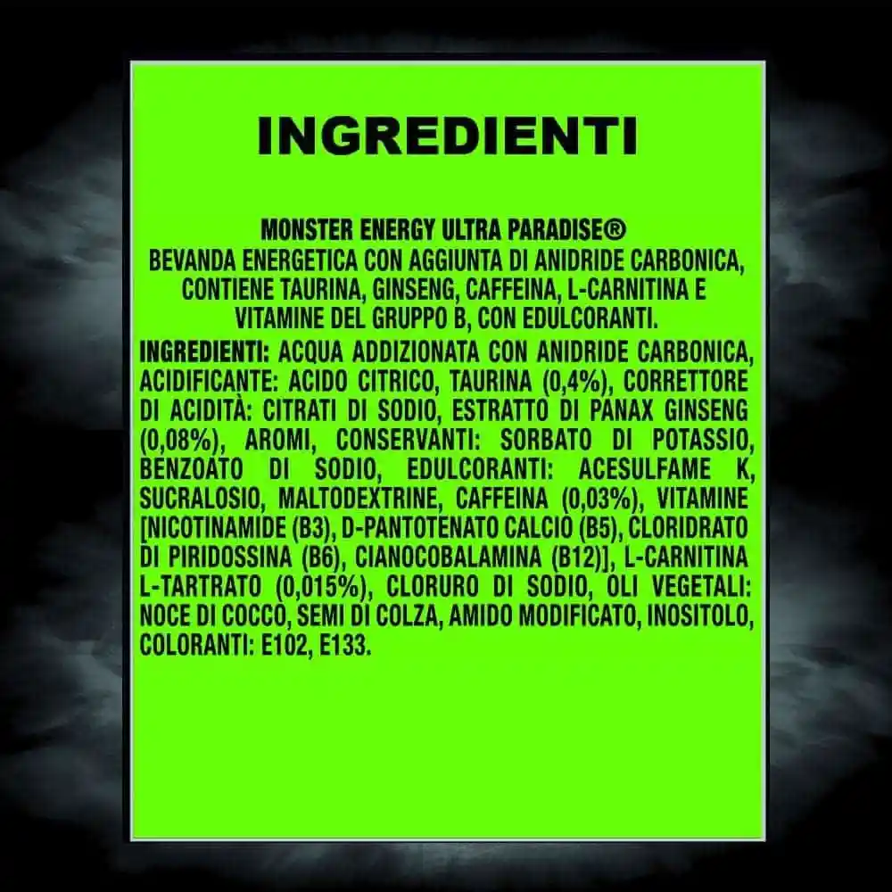 INGREDIENTI: ACQUA ADDIZIONATA CON ANIDRIDE CARBONICA, ACIDIFICANTE: ACIDO CITRICO, TAURINA (0,4%), CORRETTORE DI ACIDITÀ: CITRATO DI SODIO, ESTRATTO DI PANAX GINSENG(0,08%), AROMI, CONSERVANTI: SORBATO DI POTASSIO, BENZOATO DI SODIO, CAFFEINA (0,03%), EDULCORANTI: SUCRALOSIO, MALTODESTRINE, ACESULFAME K, L-CARNITINA L-TARTRATO (0,015%), OLI VEGETALI: NOCE DI COCCO, SEMI DI COLZA, AMIDO MODIFICATO, VITAMINE (NICOTINAMIDE B3, D-PANTOTENATO CALCIO B5, CLORIDRATO DI PIRIDOSSINA B6, CIANOCOBALAMINA B12, COLORANTI: E102, E133, INOSITOLO.