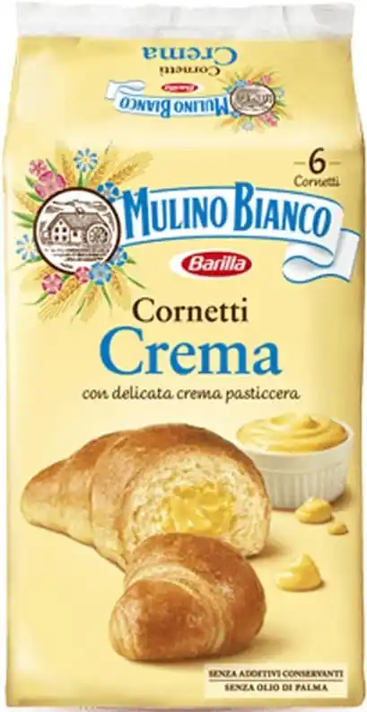 farina di frumento, crema 24,6% (zucchero, tuorlo d’uovo 22,6%, sciroppo di glucosio-fruttosio, latte intero fresco pastorizzato, latte scremato in polvere, burro di cacao, olio di girasole, amido di mais, emulsionanti: mono e digliceridi degli acidi grassi, acqua, aromi, sale), uova fresche 13%, margarina vegetale (burro di cacao, olio di girasole, olio di cocco, acqua), lievito madre 9,2% (grano), zucchero, acqua, emulsionanti: mono e digliceridi degli acidi grassi, lievito, burro, aromi (latte), olio di girasole, sale, tuorlo d’uovo 0,2%.