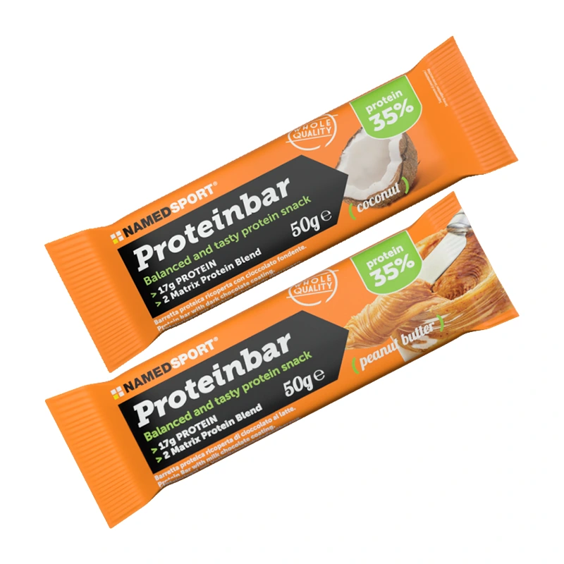 NamedSport Proteinbar è una barretta proteica a base di concentrato di proteine del siero di latte e isolato di siero di latte, olio di semi di girasole spremuto a freddo ricoperto di cioccolato fondente.