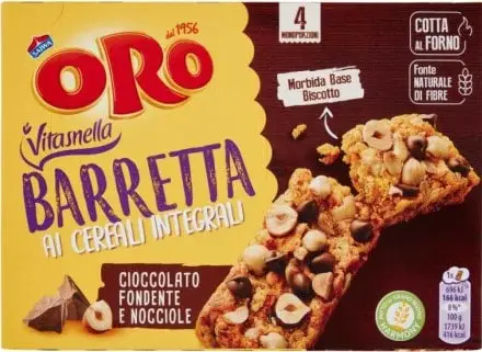 Cereali 32,7 % [farina di frumento 18,3 %, cereali integrali 11,8 % (farina di frumento integrale 5,2 %, semola di grano saraceno 3,3 %, farina di farro (grano) 1,3 %, farina di orzo integrale 1,3 %, farina di frumento maltato 0,7 %), fiocchi d’avena 1,4 %, crusca e germe di frumento 1,2 %], zucchero, gocce di cioccolato 9,8 % [pasta di cacao, zucchero, destrosio, emulsionante (lecitine di soia)] – nocciole in pezzi 6,9 %, oli vegetali (colza, girasole), mirtilli rossi americani zuccherati disidratati 6 % [zucchero, mirtilli rossi americani secchi 2 %, stabilizzante (glicerolo), olio di girasole], amido, isomaltulosio, umidificante (glicerolo), inulina, emulsionante (lecitine di soia), agente lievitante (carbonati di sodio), minerale (carbonato di magnesio), sale, aromi, latte scremato in polvere, miele, addensante (gomma di xanthan).