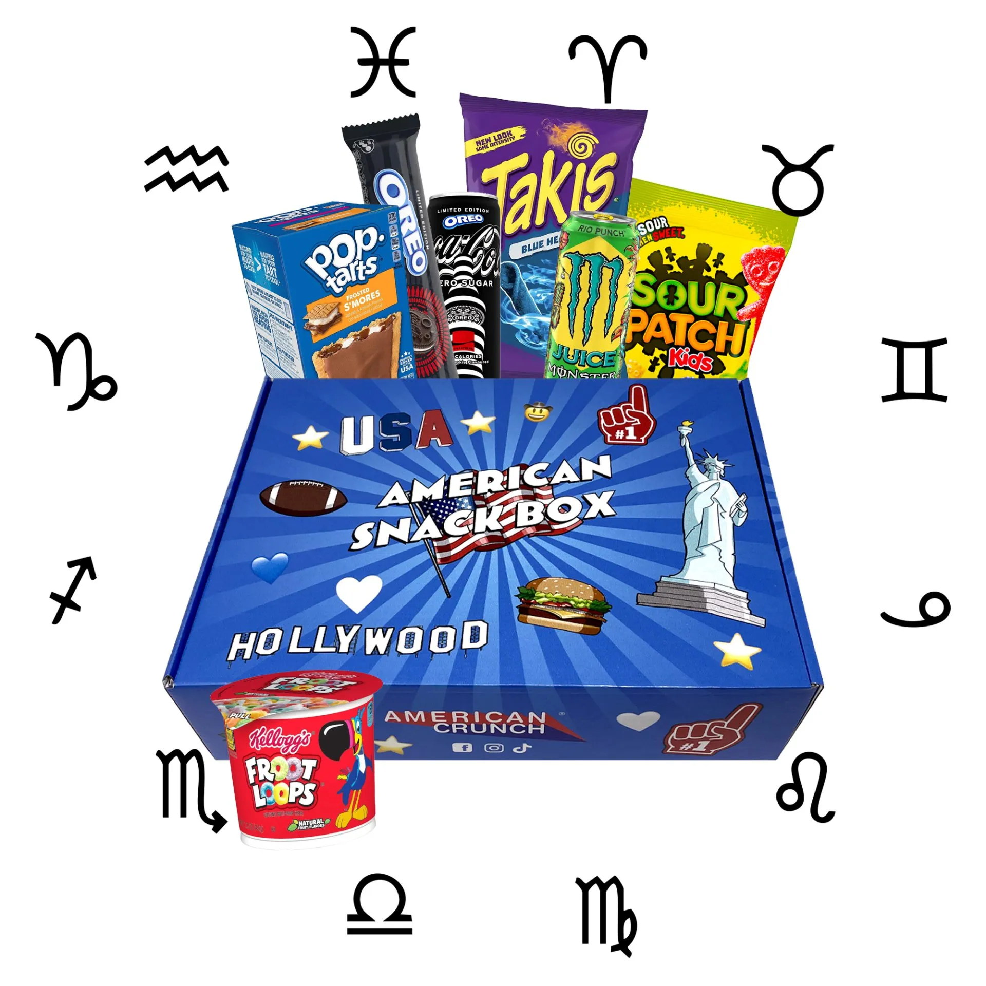 Ti garantiamo almeno 18 snack di brand americani e internazionali tra DOLCE, BEVANDE E SALATO che andranno a soddisfare le caratteristiche del tuo SEGNO Zodiacale!