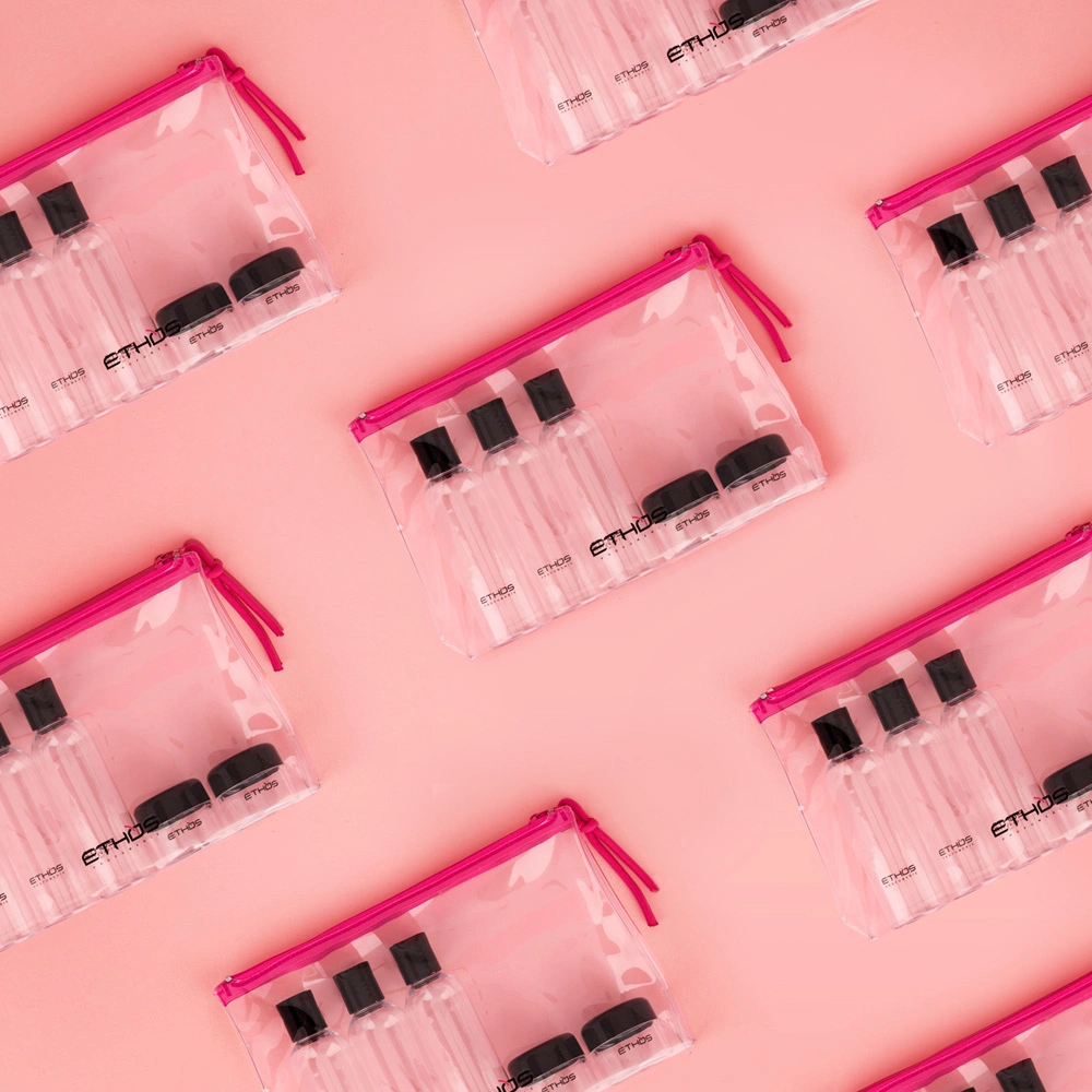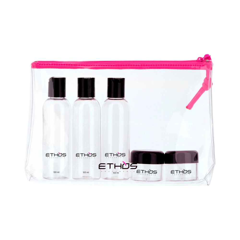 La pochette da viaggio Ethos Profumerie è composta da 5 contenitori trasparenti da viaggio: 3 flaconi da 100 ml e 2 vasetti da 30 ml da poter riempire con liquidi, creme, prodotti cosmetici e per la cura della persona.