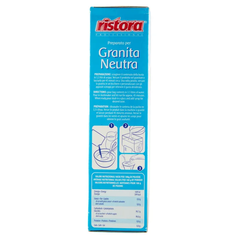 Facili da preparare, le granite Ristora sono disponibili nei classici gusti menta e limone e nella versatile base neutra da personalizzare in vari gusti con gli appositi sciroppi.