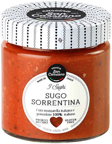Sugo preparato con pomodoro 100% italiano e mozzarella seguendo la ricetta tipica di Sorrento.