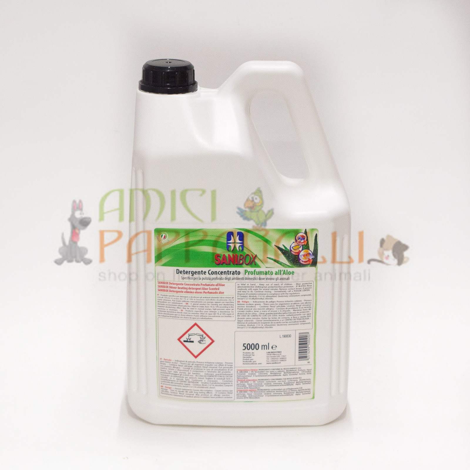 E’ un detergente concentrato in varie profumazioni. Sanibox profumato Aloe è specifico nel detergere igienizzare e deodorare gli ambienti in cui vivono cani, gatti, uccelli, roditori e tutti gli altri animali domestici