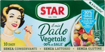 Star Dado Classico Basso Sale N.1 in Italia – Senza conservanti – Senza lattosio – Senza glutine. Con il 30% di sale in meno rispetto al dado classico standard, questo dado lega i diversi sapori delle ricette di ogni giorno, rendendole ancora più buone e armoniose.