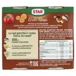 Concentrato di pomodoro (25%), acqua, carni (16%) (bovina 13%, suina 3%), funghi champignons (15%) (agaricus bisporus), funghi porcini (10%) (boletus edulis e relativo gruppo), carote, olio di semi di girasole, cipolle, sedano, amido modificato di mais, sale, prezzemolo (0,6%), aglio, zucchero, pep. può contenere tracce di: latte, uovo.