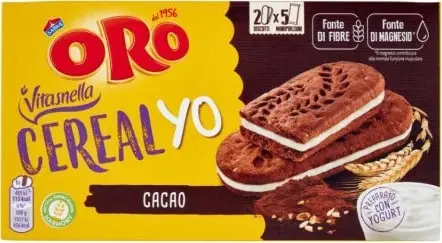 Agenti lievitanti (carbonati di sodio, difosfati, carbonati di ammonio), Zucchero, Oli vegetali (olio di colza, olio di palma, olio di cocco e palmisto in proporzioni variabili), Aromi, Emulsionanti (lecitine di soia, E472e), Cacao magro in polvere 1,8%, Minerali (carbonato di calcio, carbonato di magnesio, ferro elementare), Cereali 53,7% [farina di frumento 42,3%, cereali integrali 9,4% (fiocchi d’avena 5,2%, farina integrale di orzo 2%, farina integrale di farro (grano) 1%, farina integrale di segale 1%, chicchi integrali frantumati di avena 0,2%), crusca e germe di frumento 2 %], Correttore di acidità (acido citrico), Sale, Yogurt magro in polvere 3% (equivalente a 20 % di yogurt), Amido di frumento.
